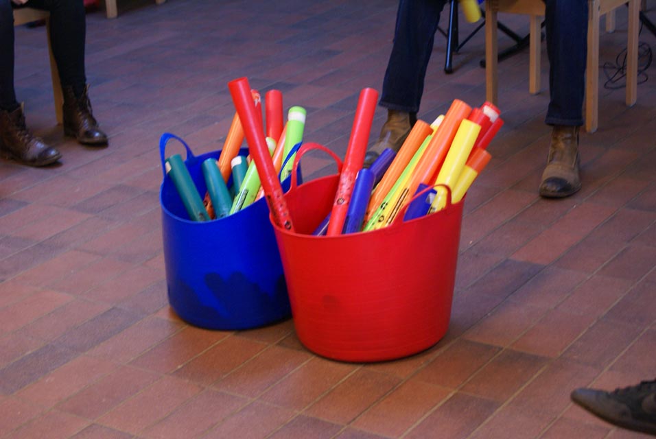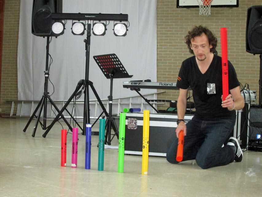 Vaak mondt een workshop uit in een toonmoment. We laten in een echt mini – optreden zien wat we die dag gedaan hebben. Ik breng een volledige licht – en geluidsset en een theaterdoek mee. Intussen ontwikkelde ik verschillende Boomwhackerliedjes waarin alle elementen uit de workshop terug komen. Kortom, een echt optreden!