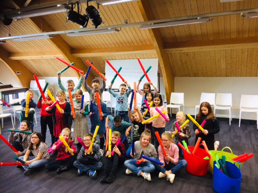 Vaak mondt een workshop uit in een toonmoment. We laten in een echt mini – optreden zien wat we die dag gedaan hebben. Ik breng een volledige licht – en geluidsset en een theaterdoek mee. Intussen ontwikkelde ik verschillende Boomwhackerliedjes waarin alle elementen uit de workshop terug komen. Kortom, een echt optreden!